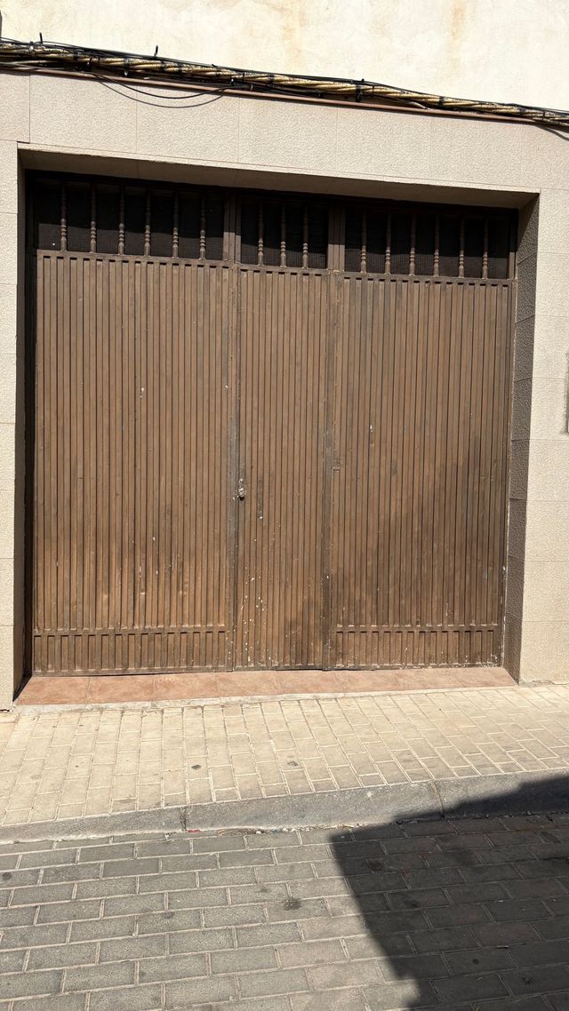 Puerta de garaje de metal - Medidas: 2.70 metros de ancho por 2.60 metros de alto. - Diseño con lamas verticales y rejas superiores.