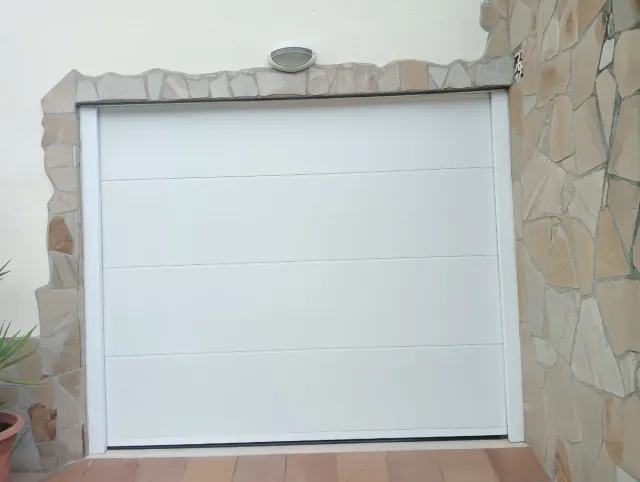 Detalles del productoPuerta de garaje automática de color blanco, con un diseño moderno y líneas horizontales. Obertura hacía el techo.