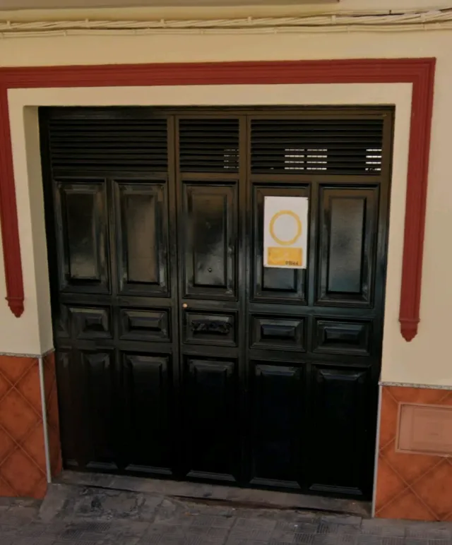 Detalles del productoPuerta de garaje de color negro. Tiene un diseño con paneles y rejillas en la parte superior.