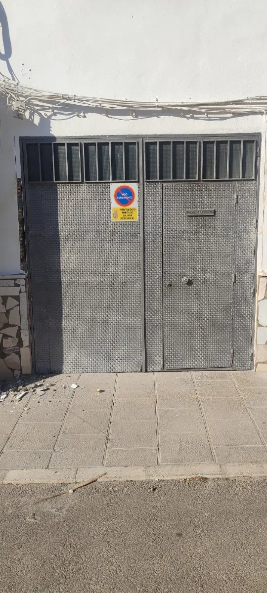 Puerta de garaje metálica de doble hoja. Presenta un diseño con un patrón de rombos. - Material: Metal. - Color: Gris.