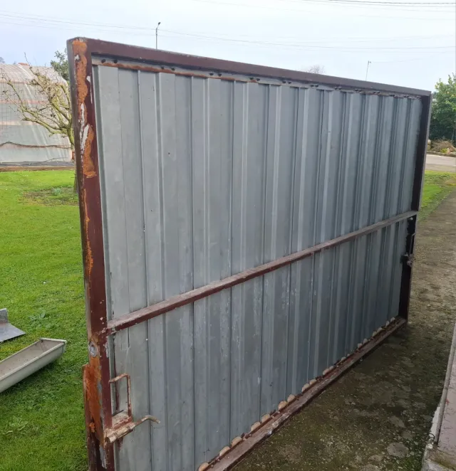Puerta de garaje de metal con marco de hierro. - Panelado acanalado. - Marco de hierro con óxido. - Cierre de palanca.
