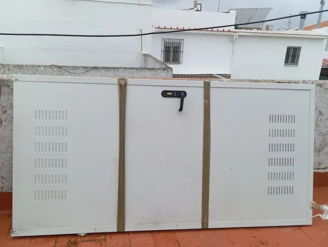 Puerta de hierro resistente, ideal para exteriores. Su diseño permite la ventilación. - Material: Hierro. - Color: Blanco. - Cierre con llave.