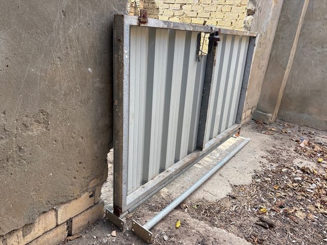 Puerta de hierro y chapa, ideal para exteriores. - Estructura metálica robusta. - Paneles de chapa acanalada.