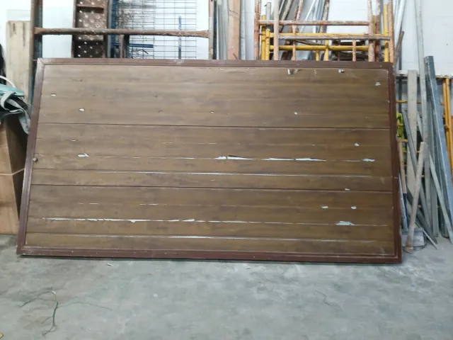 Detalles del productoPuerta de imitacion madera con acabado en color marrón. Presenta un diseño de tablones horizontales y un marco exterior.