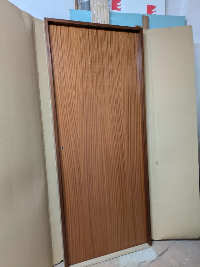 Detalles del productoPuerta de madera de sapelly con marco y guarniciones macizas todo barnizado y herrajes en inox......apertura derecha hoja 203 x 82,5 x 3,5 cm
