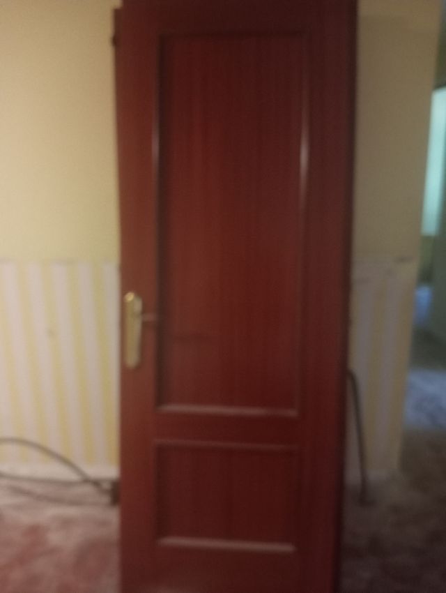 Detalles del productoPuerta de interior de madera con un acabado en color marrón oscuro. Presenta un diseño clásico con dos paneles rectangulares.