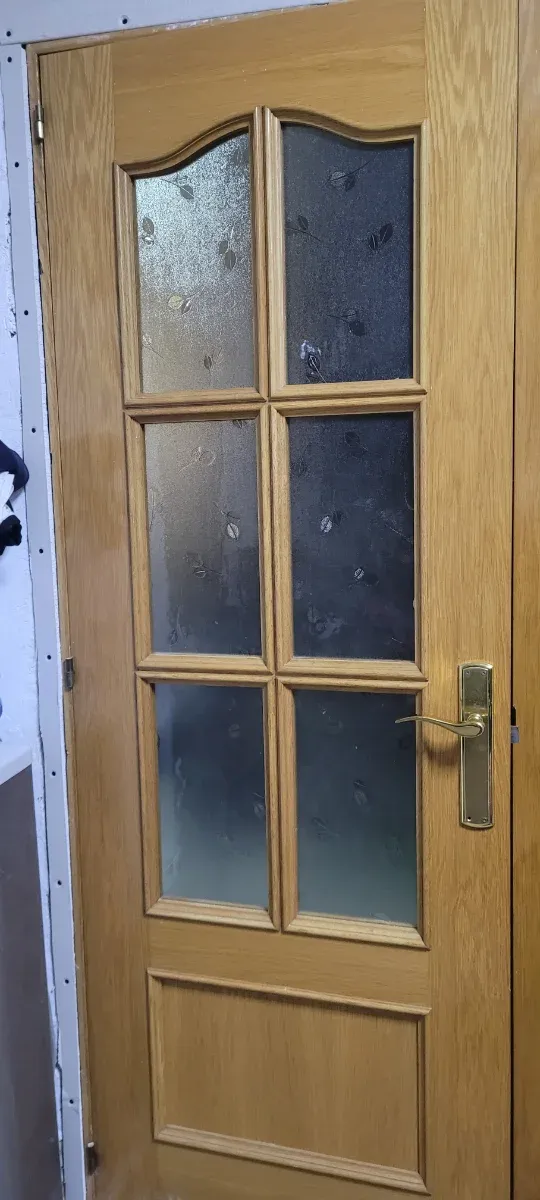 Puerta de madera con diseño de paneles y cristal. - Marco de madera. - Paneles de cristal con diseño. - Tirador metálico.
