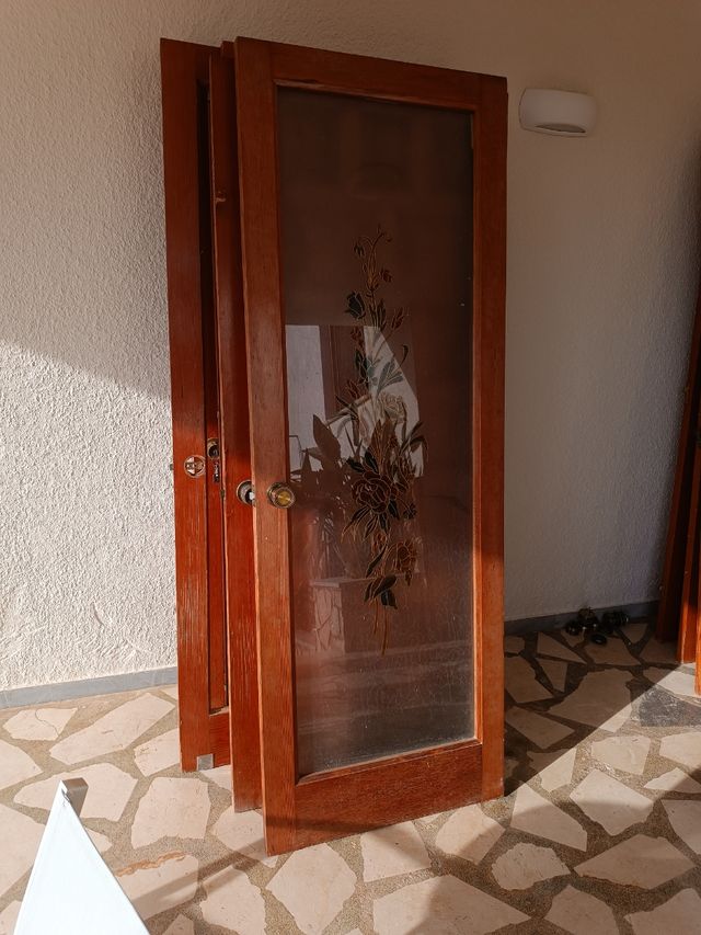 Detalles del productoElegante puerta de madera con un diseño único de cristal pintado a mano.