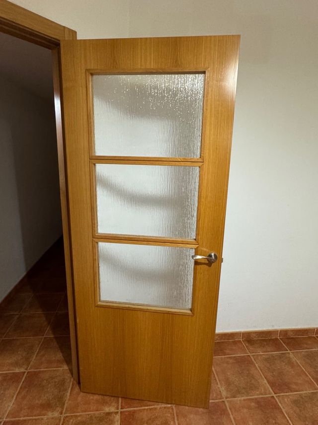 Detalles del productoPuerta de interior de madera con tres paneles de cristal.