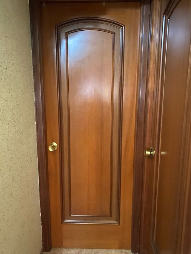 Puerta de madera para interior de habitación. Diseño clásico con molduras. - Material: Madera. - Acabado: Barnizado. - Color: Tono madera natural.
