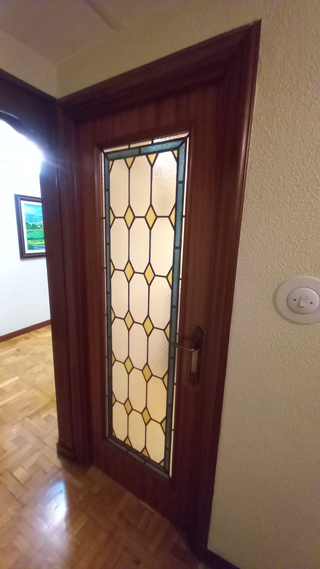 Detalles del productoPuertas de interior de madera con un panel de vidriera decorativa. Se venden una doble de dos hojas de 60 y otra simple de 70.