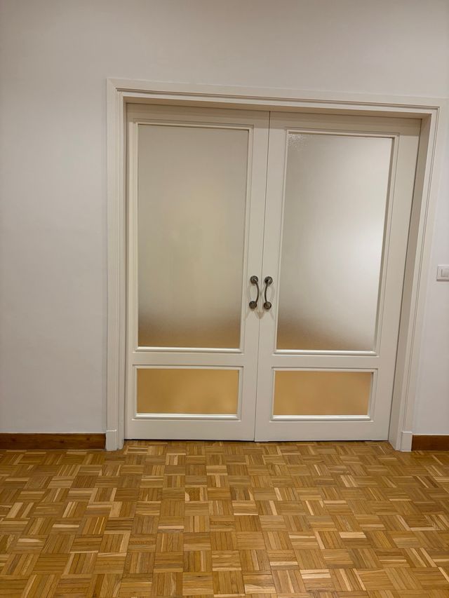 Detalles del productoPuerta de nadera corredera lacada en blanco con detalles de cristal.