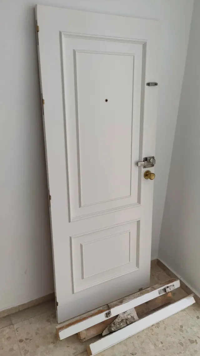 Puerta de madera para entrada principal. Diseño clásico con paneles. - Color blanco. - Incluye cerradura y pomo.