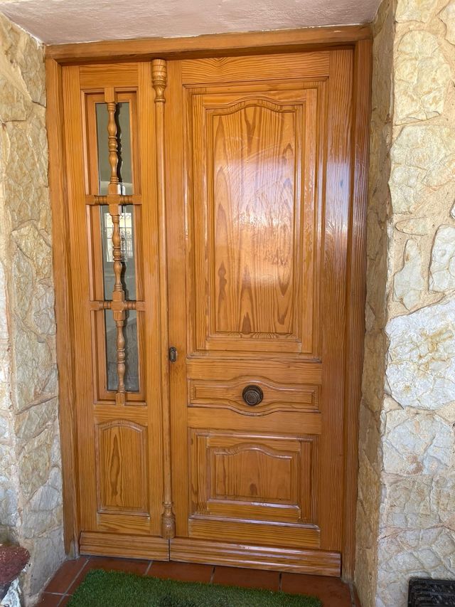 Puerta de entrada de madera de pino con un diseño clásico y elegante. - Fabricada en madera de pino. - Acabado barnizado. - Incluye marco y premarco.