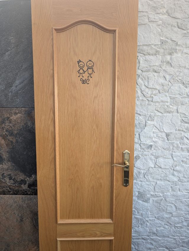 Puerta de madera maciza color roble para baño. Diseño clásico con un detalle decorativo. - Incluye: Manilla dorada, premarco y molduras.