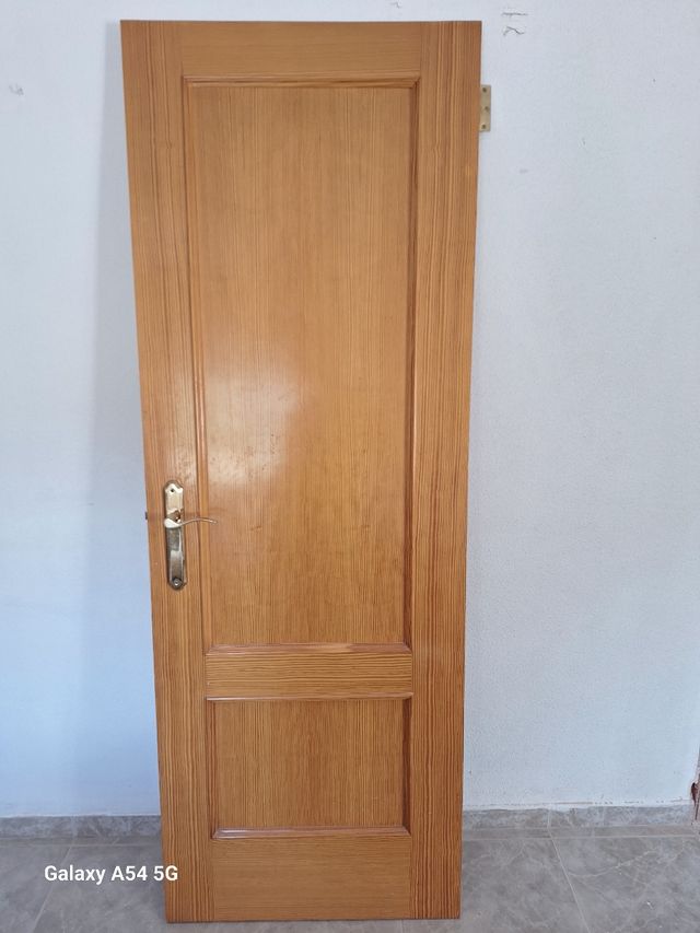 Puerta de madera de pino de medidas estándar de 72cm de ancho y 2,02 m de altura. Se vende completa con bisagras, cerradura y tapajuntas