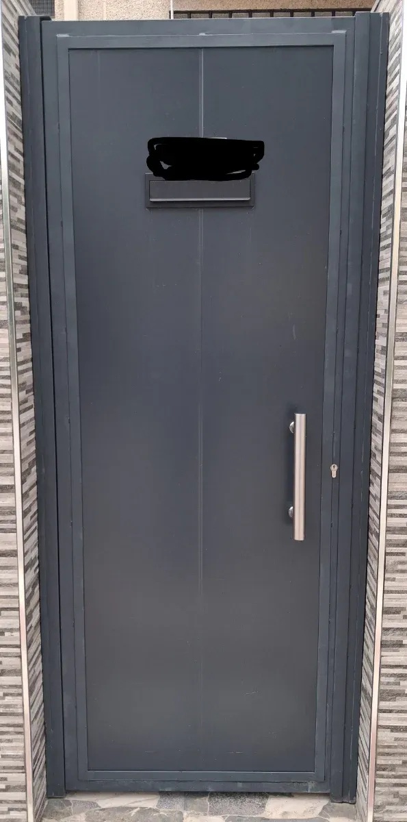 Detalles del productoPuerta de entrada de metal en color gris oscuro. Cuenta con un diseño moderno y robusto.