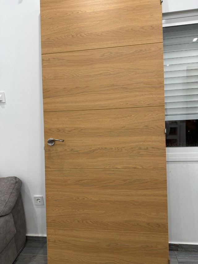 Detalles del productoPuerta de paso con acabado en madera. Diseño moderno con líneas horizontales.