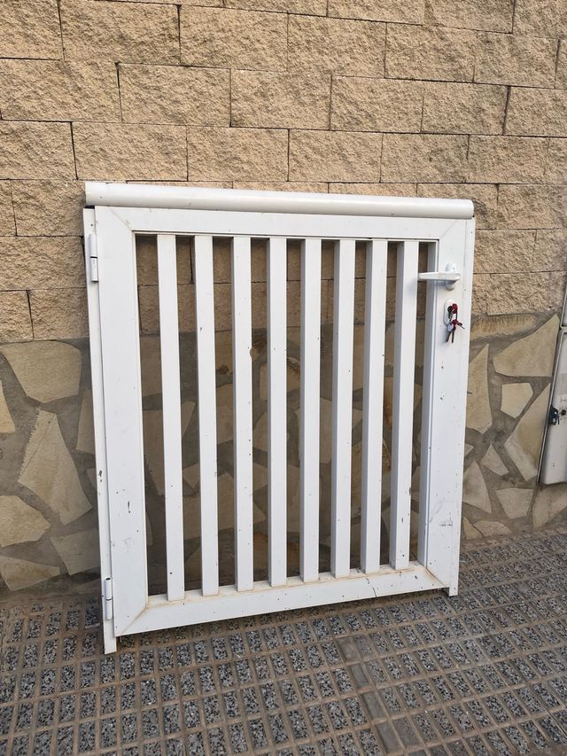 Puerta de patio de color blanco, ideal para exteriores. - Estructura de metal. - Diseño con barrotes verticales. - Incluye manilla y cerradura con llaves. - 1,10x0,95