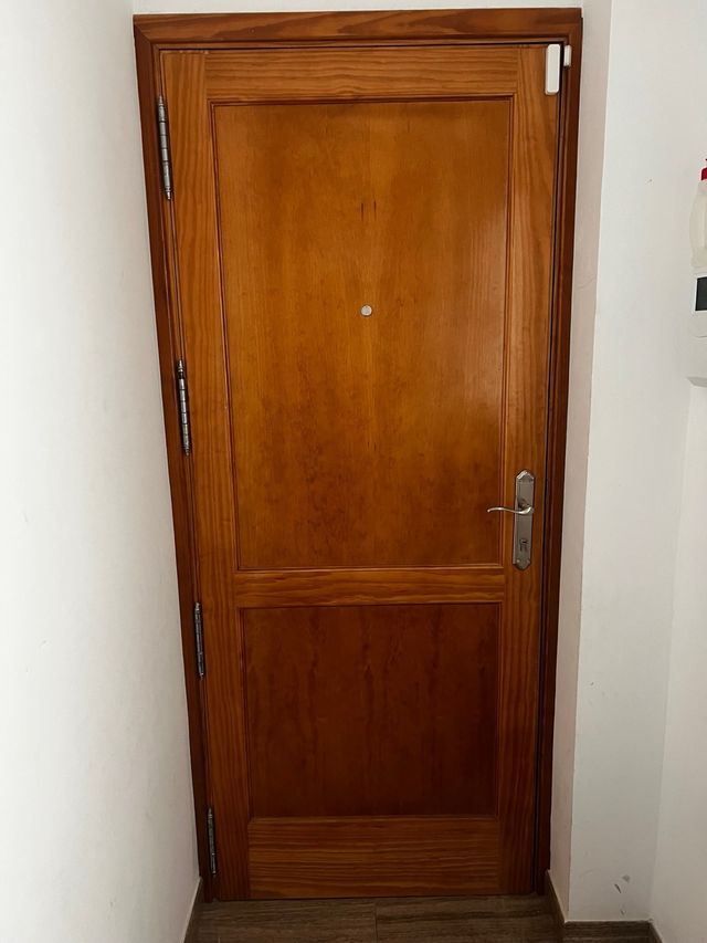 Puerta de seguridad de madera con acabado natural. - Diseño clásico de dos paneles. - Incluye cerradura y manilla.