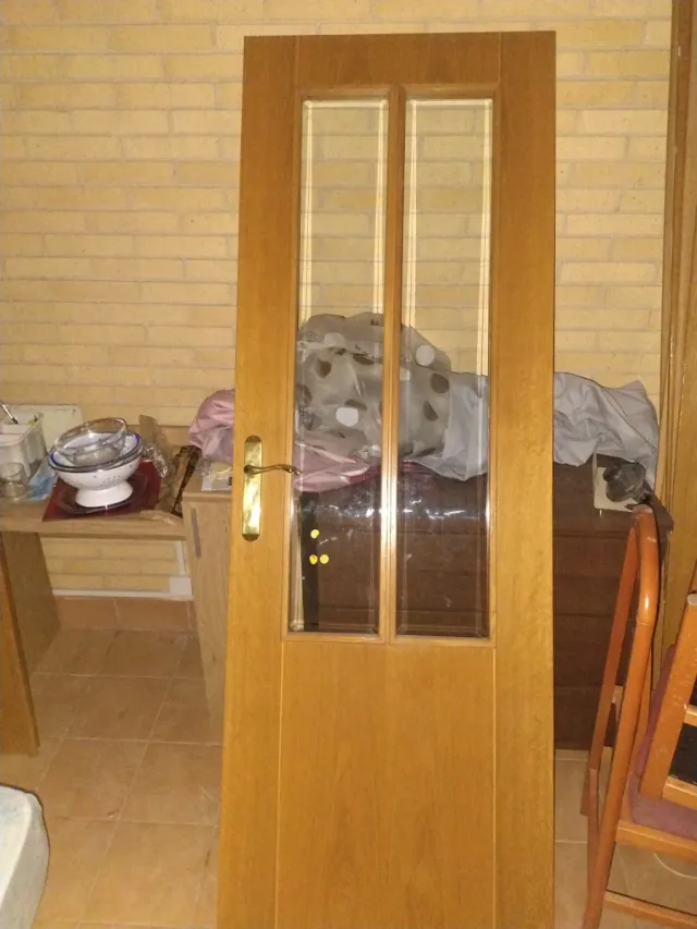 Puerta doble de madera para comedor con dos paneles de cristal. - Diseño clásico y elegante. - Acabado en madera clara. - Tirador metálico dorado.