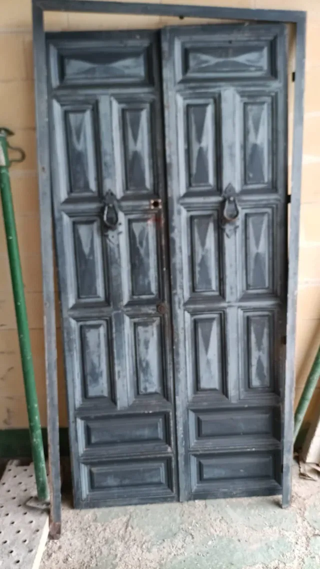 Detalles del productoPuerta doble de hierro para exterior. Presenta un diseño clásico con paneles.