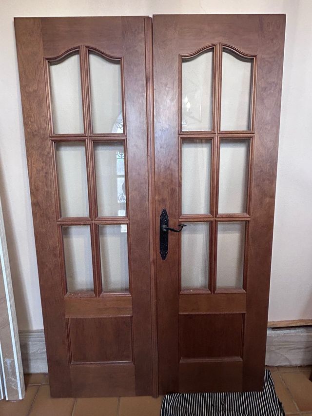 Detalles del productoElegante puerta doble de madera maciza con paneles de cristal.