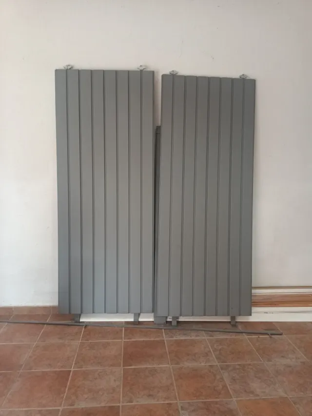 Puerta de dos hojas de color gris. Ideal para dividir espacios. - 198 cm alto - 79 cm ancho cada hoja (2) - Diseño moderno con lamas verticales. - Acabado mate.
