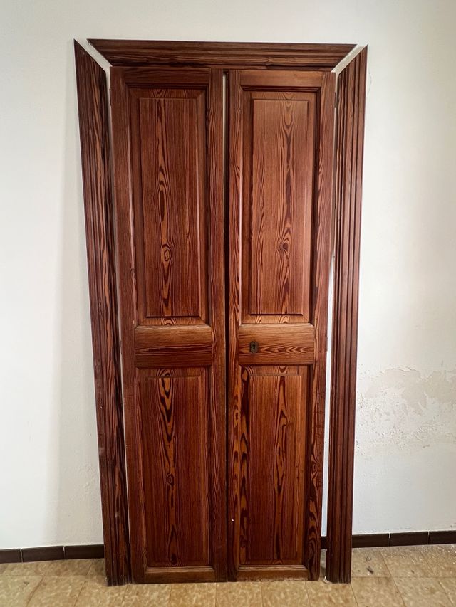Detalles del productoElegante puerta doble de madera antigua, con un diseño clásico y detalles de molduras.