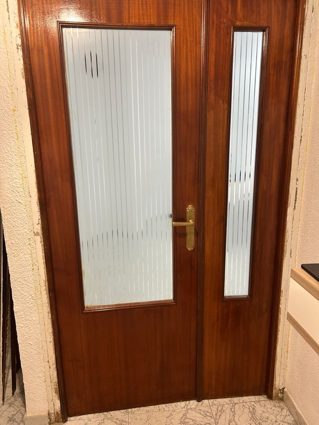 Detalles del productoPreciosa puerta de salón de madera maciza, con doble hoja y cristales con diseño de líneas verticales. Está en buen estado.