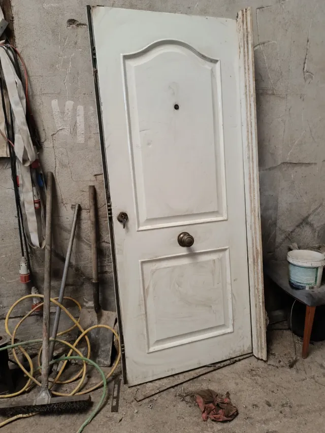 Puerta de exterior en color blanco, fabricada en aluminio. Solo tiene medio marco - Diseño con paneles. - Incluye pomo y cerradura.