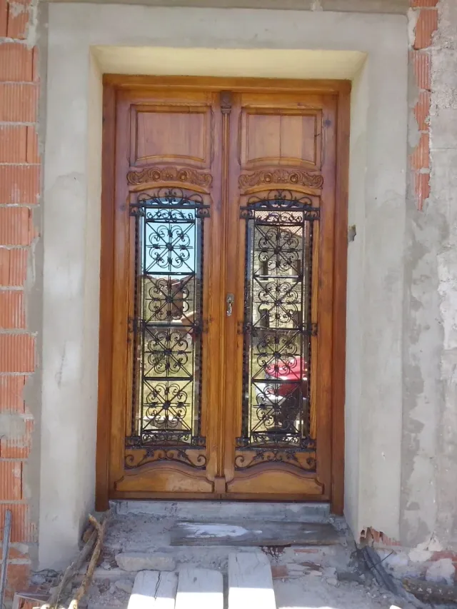 Detalles del productoElegante puerta exterior de madera maciza, ideal para dar un toque clásico a tu hogar. Diseñada con detalles ornamentales y rejas de forja.