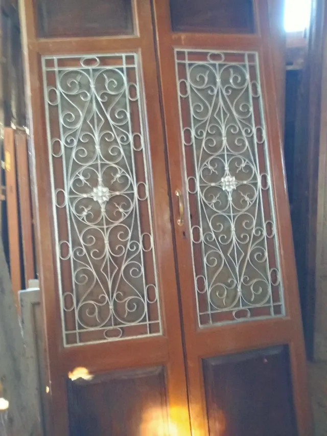Puerta exterior de madera con un diseño elegante y seguro. - Marco de madera resistente. - Panel decorativo con reja de metal. - Tirador metálico.