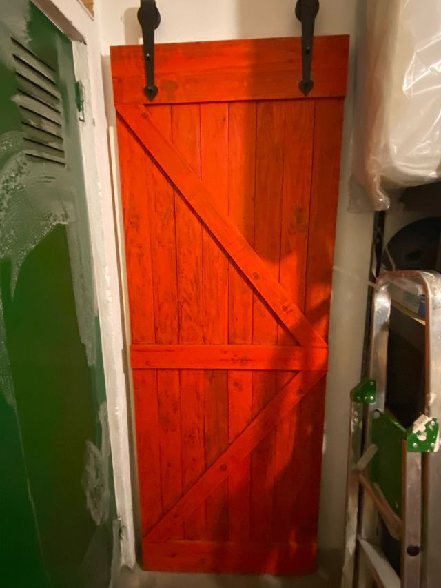 Detalles del productoPuerta de granero artesanal con un diseño rústico y un vibrante acabado naranja. Perfecta para añadir un toque único a tu hogar.