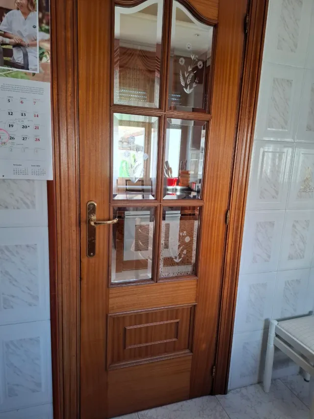 Detalles del productoPuerta interior de madera con detalles de cristal.