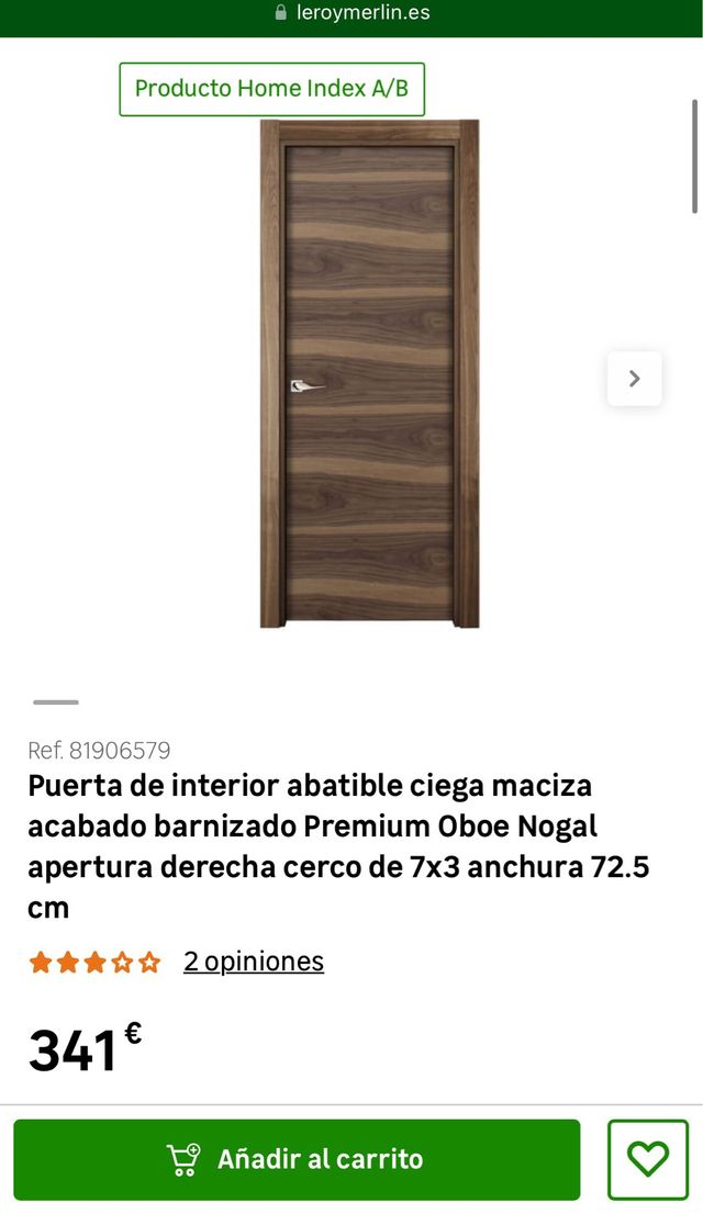 Detalles del productoPuerta de interior abatible ciega maciza acabado barnizado Premium Oboe Nogal apertura derecha cerco de 7x3 anchura 72.5 cm