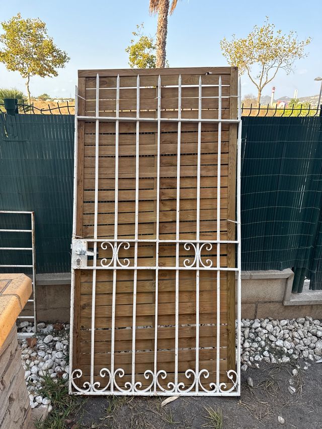 Detalles del productoPreciosa puerta de jardín de hierro forjado, color blanco. Ideal para dar un toque rústico y elegante a tu jardín. - Estructura de hierro resistente. - Diseño con detalles decorativos. - Incluye madera en la parte trasera.