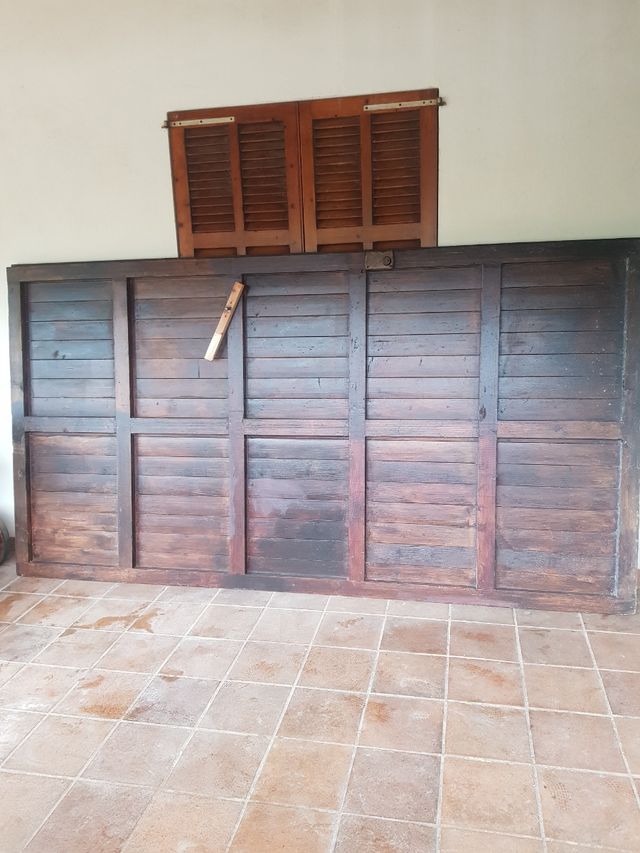 Detalles del productoPuertas madera, dos ojas, para garaje, casa, etc, se podrian utilizar para otros fines, mesa, pared, tapavientos. Medidas 2,80 alto x 3,00 ancho (total juntas). Se encuentran en buen estado, el exterior se tendria que pintar, y los bajos estan un poco desechos por el agua, se entregan con cerradura, pero sin bisagras. Casa rural, posesio, hotel, local, vintage, antiguedad, obra, arquitectura, años 80, 90, fabricar mesa, mueble, retro. Llamar para mas informacion.gracis