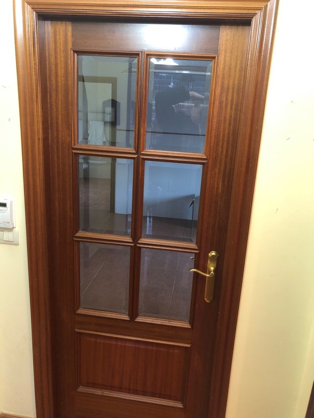 Detalles del productoPuerta de madera con detalles de cristal.