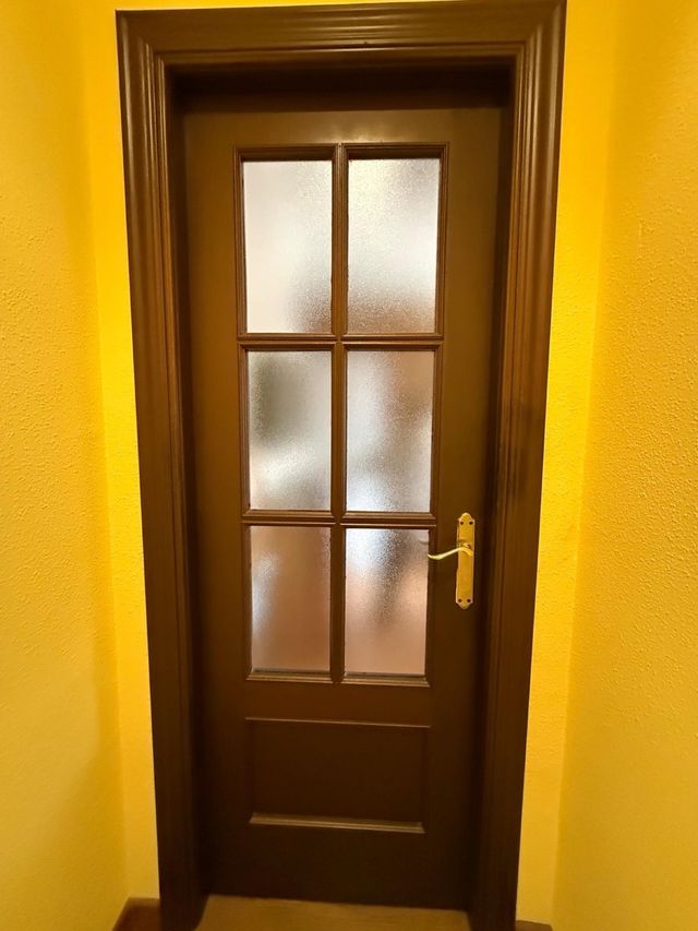 Puerta de madera con diseño acristalado. - Medidas: 72 cm de ancho x 202.5 cm de alto. - Acabado en madera oscura. - Paneles de cristal esmerilado.