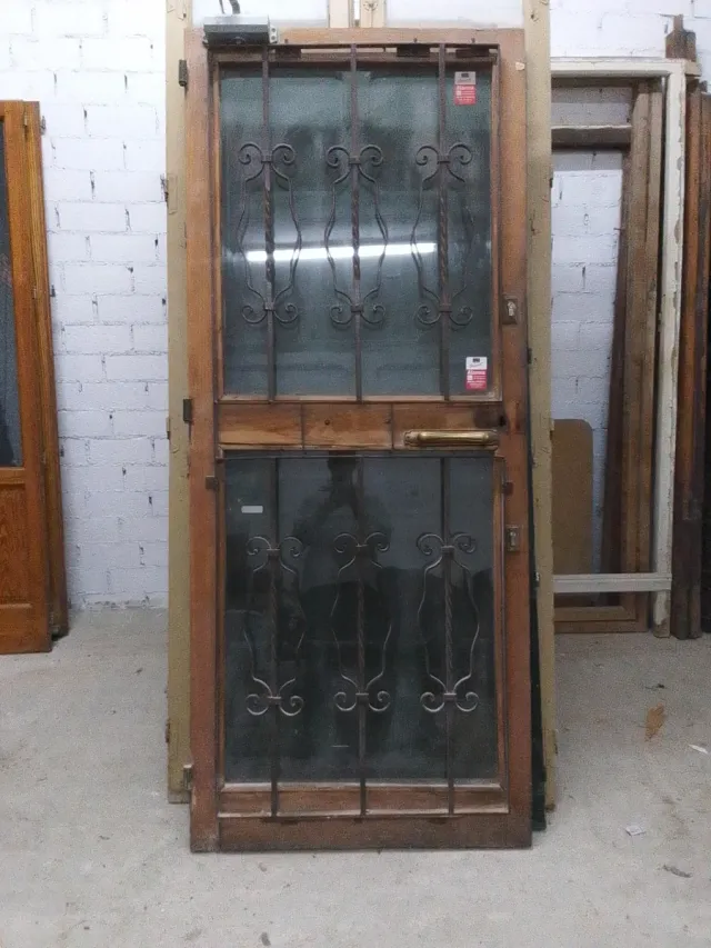 Detalles del productoPuerta de entrada con un diseño clásico que combina madera, hierro forjado y cristal.