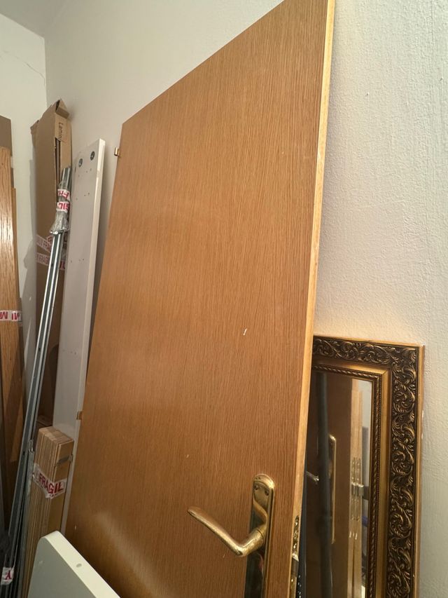 Puerta de madera en buen estado, lista para instalar. - Color marrón claro. - Material: madera maciza. - Incluye manilla dorada.