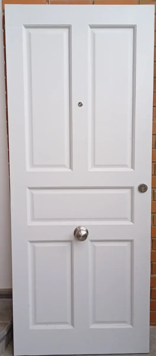 Puerta de madera maciza en color blanco. 81,5cm ancho, 200,5cm largo. - Diseño de cuatro paneles. - Acabado liso.