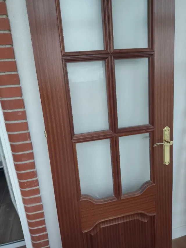 Detalles del productoPuerta de madera maciza con detalles de cristal esmerilado.