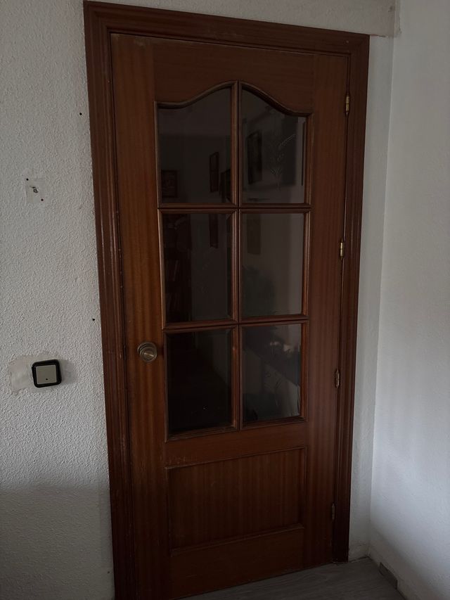 Puerta de madera maciza color oscuro, dos de ellas con cristales, en buen estado ninguna tiene holgura , la de la habitación esta un poco astillada ...