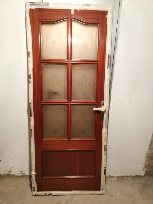 Detalles del productoPuerta de madera con diseño tipo francesa, ideal para interiores. Cuenta con paneles de cristal esmerilado con un sutil grabado. Biene con el marco.