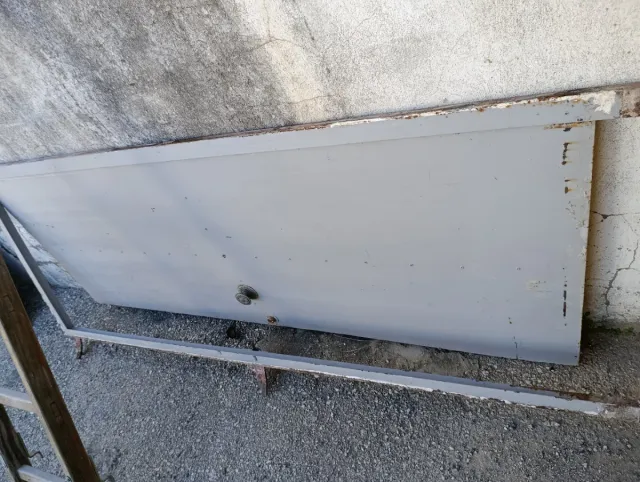 Puerta metálica de color gris, ideal para exteriores o interiores.