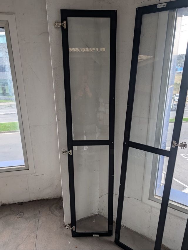 Detalles del productoPuerta de diseño moderno con estructura negra de madera y paneles de vidrio.