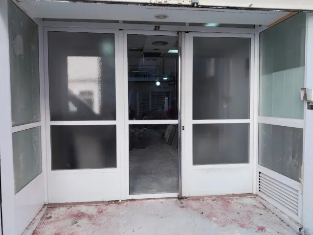 Detalles del productoPuerta principal con marco de aluminio y paneles de cristal.