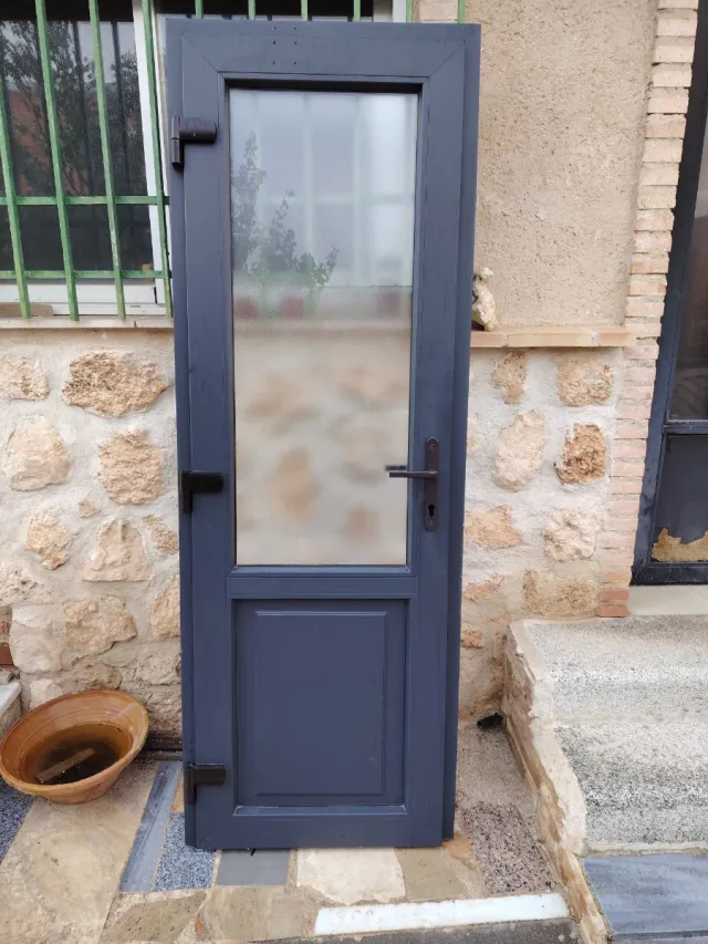 Detalles del productoPuerta de PVC en color gris, con un panel inferior y una sección superior de cristal.
